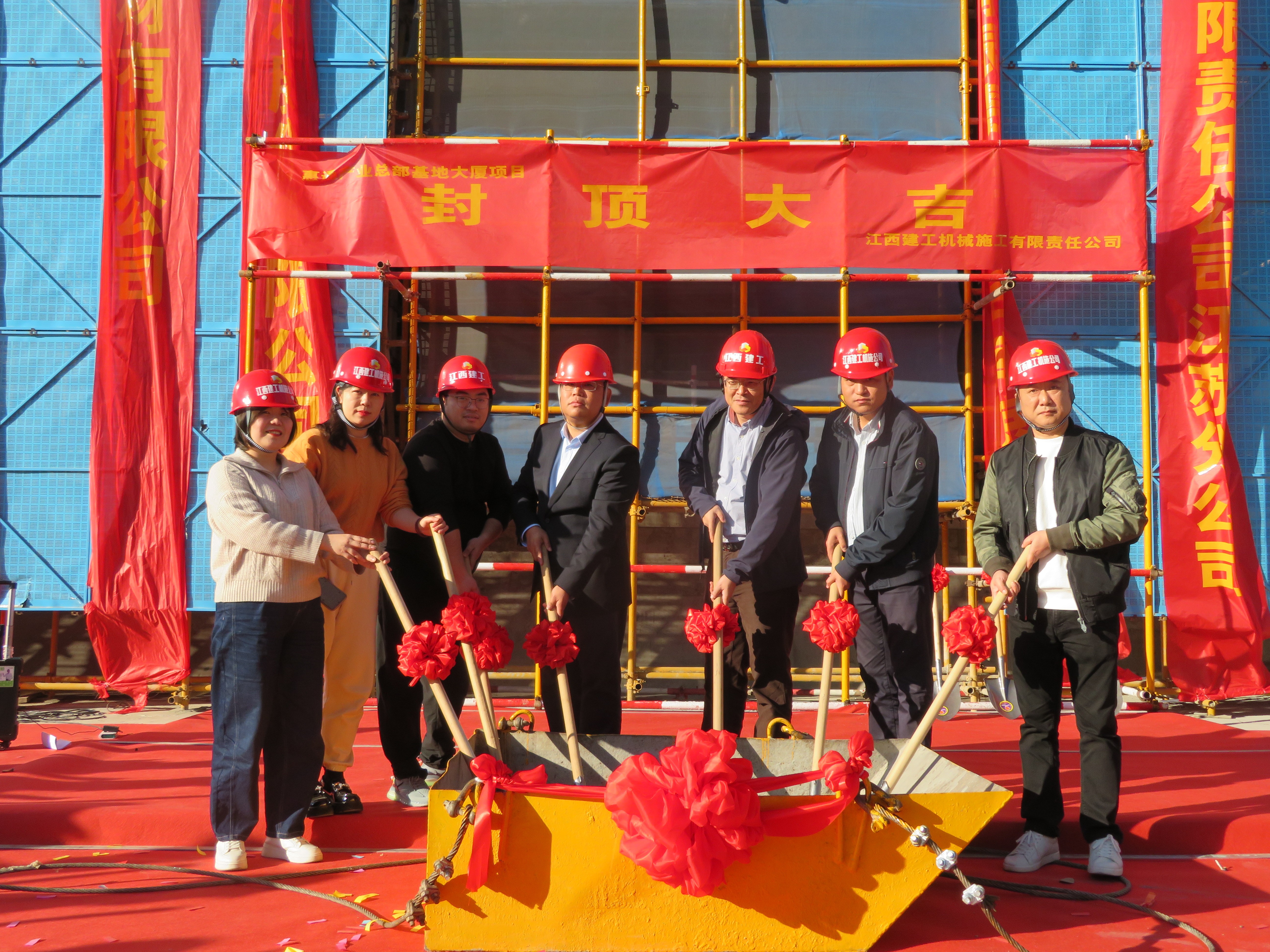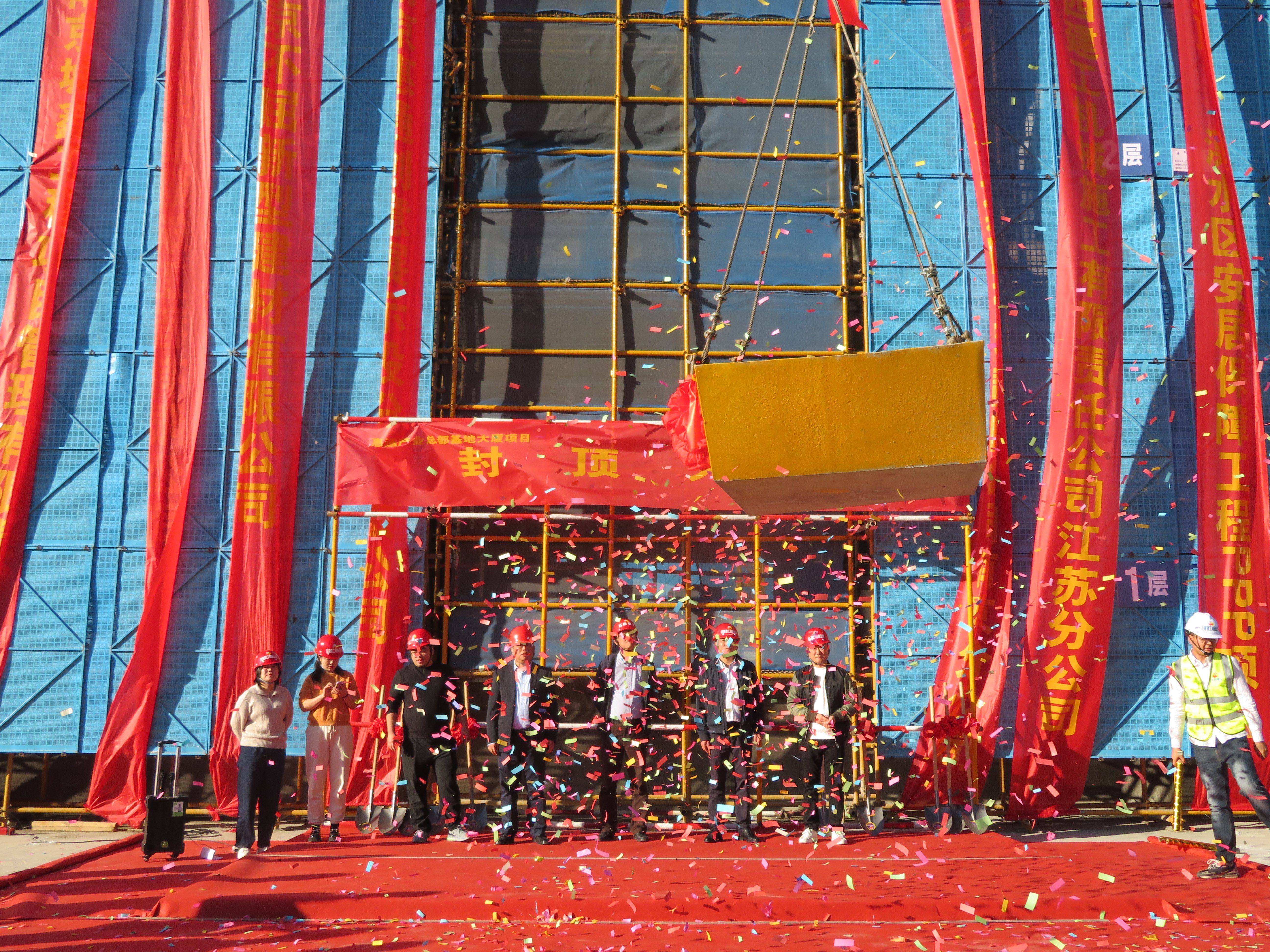 儀式現(xiàn)場(chǎng),“封頂大吉”四個(gè)大字金光燦燦。江蘇分公司領(lǐng)導(dǎo)班子一道揚(yáng)起鐵鍬,將最后一斗混凝土注入樓頂。