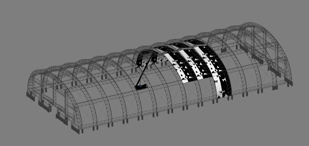 3#硫酸銨棚用途為存放散裝硫酸銨,采用三心圓柱面正三角型鋼管桁架結(jié)構(gòu),管桁架高度約為41.1,平面尺寸為長(zhǎng)240mX寬104m,主管桁架厚度為3.8m。下弦懸掛膜結(jié)構(gòu),膜結(jié)構(gòu)采用單層PVDF耐酸堿環(huán)境膜材,此舉有效解決了具有弱酸性強(qiáng)腐蝕性硫酸銨對(duì)建筑主體鋼結(jié)構(gòu)的腐蝕問(wèn)題,在沿海地區(qū)存放散裝硫酸銨的管桁架反吊膜罩棚為目前全國(guó)首創(chuàng)。